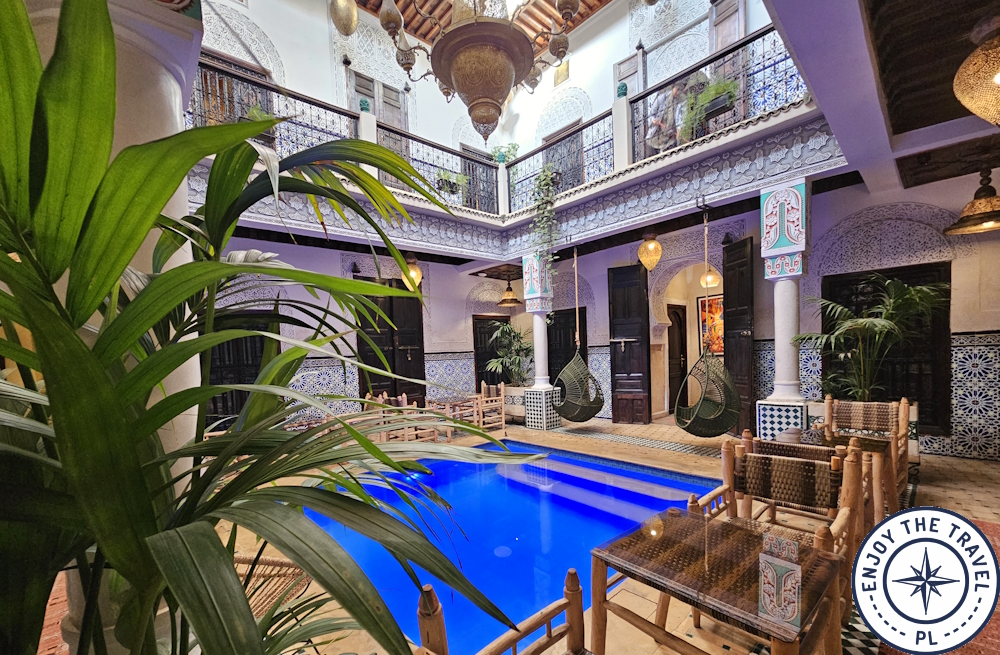 Maroko oferuje ogromny wybór noclegów. Od tanich pensjonatów po luksusowe hotele. Najbardziej charakterystyczne są riady, czyli tradycyjne domy z wewnętrznym dziedzińcem, najczęściej położone w medinach. To one dają największe poczucie lokalnego klimatu. I jeśli będziecie w Maroku na własną rękę to przynajmniej jedną noc musicie spędzić w riadzie. To doświadczenie zupełnie inne od noclegów, które znamy z innych kierunków. Najczęściej riady znajdują się w medinach więc dotarcie do nich może wyglądać trochę przerażająco – wąskie uliczki, gwar, tłok, ciemne zakątki… ale po wejściu do środka poczujecie się jakbyście weszli do innego świata. Warto!